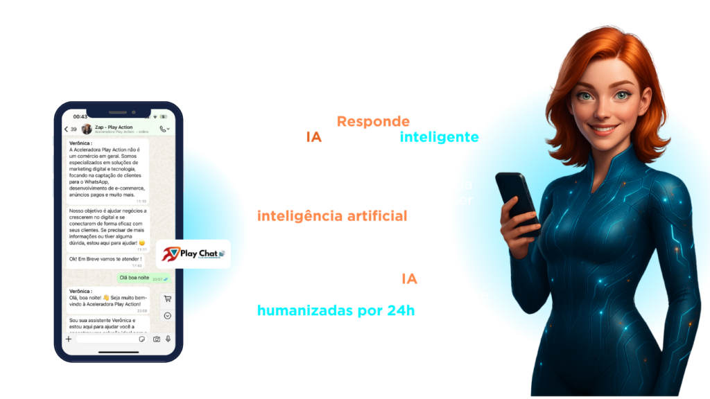 Com a Play Chat IA, seus clientes são atendidos a qualquer hora, todos os dias, com respostas inteligentes e personalizadas. Uma experiência humanizada e contínua, sem depender de horário comercial ou equipe disponível.